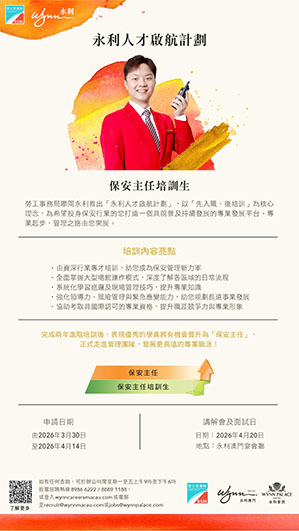該計劃合共提供12個職位空缺,包括6個“保安主任培訓生"職位空缺及6個“保安控制室主任培訓生"職位空缺。獲計劃錄取的參加者將由永利安排為期24個月的專業培訓及工作實踐。培訓內容包括跨部門協調與關係管理、日常營運標準作業程序、重大危機管理、消防安全與應急處置訓練及安排僱員考取澳門職業技能認可基準(MORS)等。
