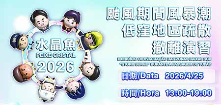 隨著本澳颱風季節即將來臨,為強化社區防災意識,民防架構將於4月25日星期六下午1時至7時,進行代號“水晶魚2026”民防颱風演習。是次演習模擬本澳受超強颱風“水晶魚2026”正面吹襲,地球物理氣象局一度發出十號風球及黑色風暴潮警告信號,低窪地區出現嚴重水浸,並引發多宗突發事故。屆時,民防架構將透過實地和桌上方式演練多項應急救援行動,並同步執行“颱風期間風暴潮低窪地區疏散撤離專項應變計劃”,參與疏散演練的人員由民防架構、民間團體及事前經公開報名的市民共同組成,因此,一般市民及旅客毋須參與疏散撤離。