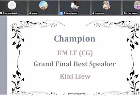 總決賽中,澳大社會科學學院、滿珍書院學生唐卓文和科技學院、榮譽學院、紹邦書院學生劉福琪力壓對手,勇奪賽事冠軍。劉福琪同時獲得“總決賽最佳辯手”和“賽事第三最佳辯手”的榮譽,唐卓文則獲得“賽事第四最佳辯手”的榮譽。