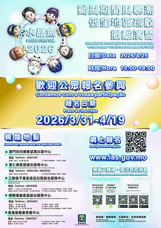 【特訊】為進一步提升社會大眾的民防意識,凝聚警民合力,民防架構將於4月25日(星期六)舉行代號“水晶魚2026”的大型民防演習。屆時將模擬執行“颱風期間風暴潮低窪地區疏散撤離專項應變計劃”,透過實地演練,讓市民親身體驗疏散撤離流程、熟悉避險中心路線及掌握相關注意事項,從而提高面對自然災害時的自我保護意識與應變能力,歡迎廣大市民踴躍參與。