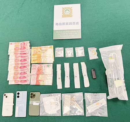 案情指,前日早上,司警接獲路氹某酒店職員報案,指早前清潔工人打掃某房間發生懷疑有毒品及吸毒工具。司警人員到場在保安協助下,於酒店範圍內拘捕涉案的施姓及兩名陳姓男子,帶返該房調查。當時該房間未退房,司警在餐檯上起出一點四二克海洛英、零點四一克冰毒以及吸毒工具,毒品市值三千二百澳門元。司警查悉,疑犯有吸毒的習慣,早前施姓男子從內地偷運毒品來澳後,與兩名陳姓男子一同吸食。三人經驗尿證實對毒品呈陽性反應。司警正追查毒品的來源。