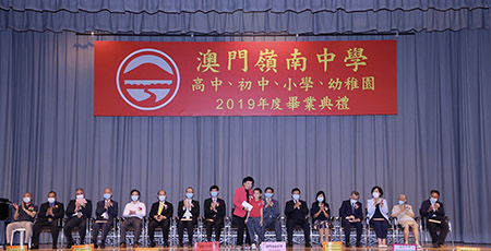 【特訊】嶺南中學日前舉行了二零一九年度高中、初中、小學及幼稚園畢業典禮。出席典禮的主禮嘉賓有中聯辦台務部部長徐莽,教青局局長老柏生,高等教育局局長蘇朝暉,中華教育會理事長鄭洪光、副會長何少金、名譽顧問劉羨冰,安達置業有限公司董事長鄺達財,澳門葡國台灣貿易商會會長張偉智,陳炳華建築師事務所建築師陳權昌,盧梁建築工程設計顧問有限公司執行董事梁志鏗,永基中東工程有限公司董事總經理馬耀良,婦女聯合總會理事長林婉妹,美術協會會長陸曦、監事長黎鷹及中國澳門體育總會聯合會理事長陳永傑等。