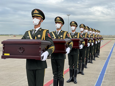 交接儀式上,中韓雙方代表現場簽署交接書,確認交接109位在韓中國人民志願軍烈士遺骸及相關遺物。中國駐韓國大使邢海明為志願軍烈士棺槨覆蓋國旗,中方舉行悼念儀式,中國人民解放軍禮兵護送烈士棺槨登上解放軍空軍專機,烈士英靈將回到祖國和人民懷抱。
