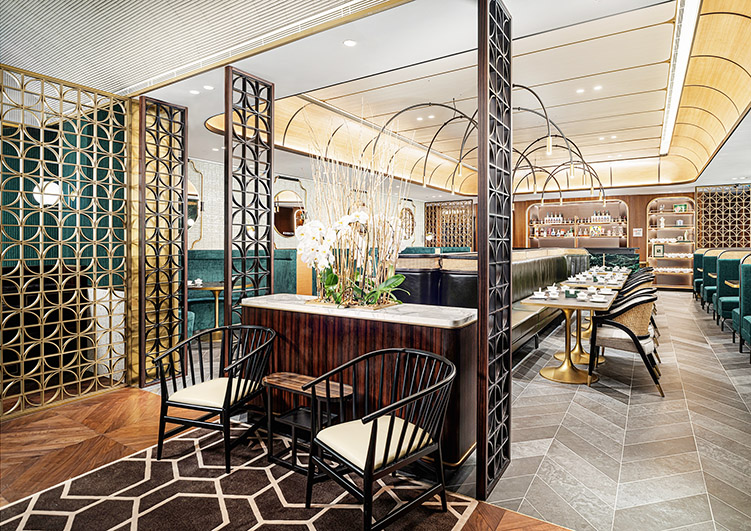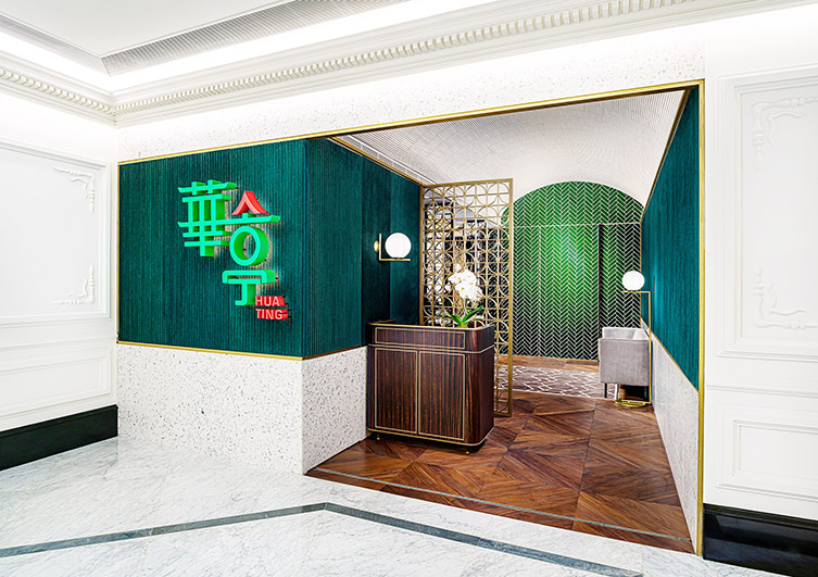 設計格調優雅的華亭和諧糅合經典元素與創新設計,襯以翠綠與燦金相間的柔和色調,締造出摩登復古的用餐環境。
