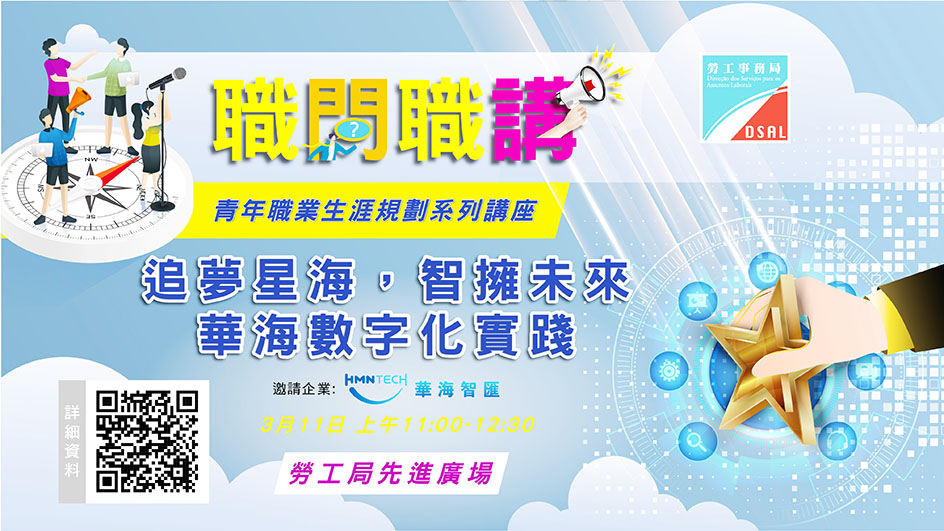 講座於3月11日(星期六)上午11時在勞工局先進廣場辦事處多功能室舉行,主題為 “追夢星海,智擁未來,華海數字化實踐分享”,由華海港澳及華南區解決方案康磊主管主講。通過講座介紹智慧類項目建設、集成解決方案和數字化轉型技術等資訊,並即場回答青年對有關行業前景方面的查詢。