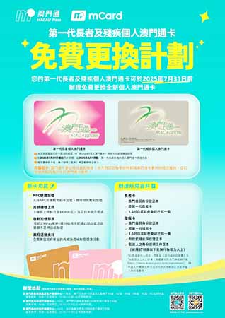 【特訊】澳門通公司宣佈,自2025年6月2日起至7月31日期間,將為第一代長者卡及殘疾卡的個人澳門通卡用戶開啟免費換卡通道。此次換卡旨在順應技術發展與系統升級需求,進一步加強交易安全管理並提升服務品質。相關持卡用戶可携帶符合資格的辦理文件,前往澳門通三家客戶服務中心免費辦理換卡。