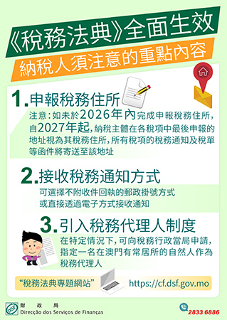 財政局提醒,倘未於2026年內完成稅務住所申報,自2027年起,將以納稅主體在各稅項中最後申報的地址視為其稅務住所,所有稅務文件將寄送至該地址。