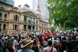 當天傍晚,數千名抗議者聚集在悉尼市政廳外,手持標語、揮舞旗幟,高喊支持巴勒斯坦的口號,並表示澳大利亞“不歡迎”赫爾佐格。記者在集會現場看到,大量警員值守,一架直升機在空中盤旋,騎警在周邊區域巡邏。