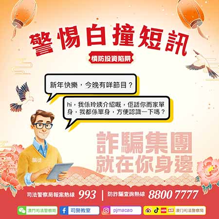 司警局反詐騙協調中心呼籲市民:對於突如其來的陌生網友必須提高警惕;投資涉及風險,慎防任何“低風險、高回報、穩賺必贏”的投資建議;如有懷疑,應使用司警局“反詐程式”查核風險指數,又或致電司警局防詐騙查詢熱線88007777或報案熱線993求助。