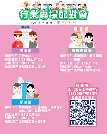 【特訊】為持續推動就業配對,協助本澳居民就業、回應業界人力資源需求和壓力,勞工事務局(下稱“勞工局”)與澳門工會聯合總會(下稱“工聯”)續辦三場行業專場配對會,合共提供415個職位空缺。報名期由今(26)日上午9時起至3月30日中午12時止。