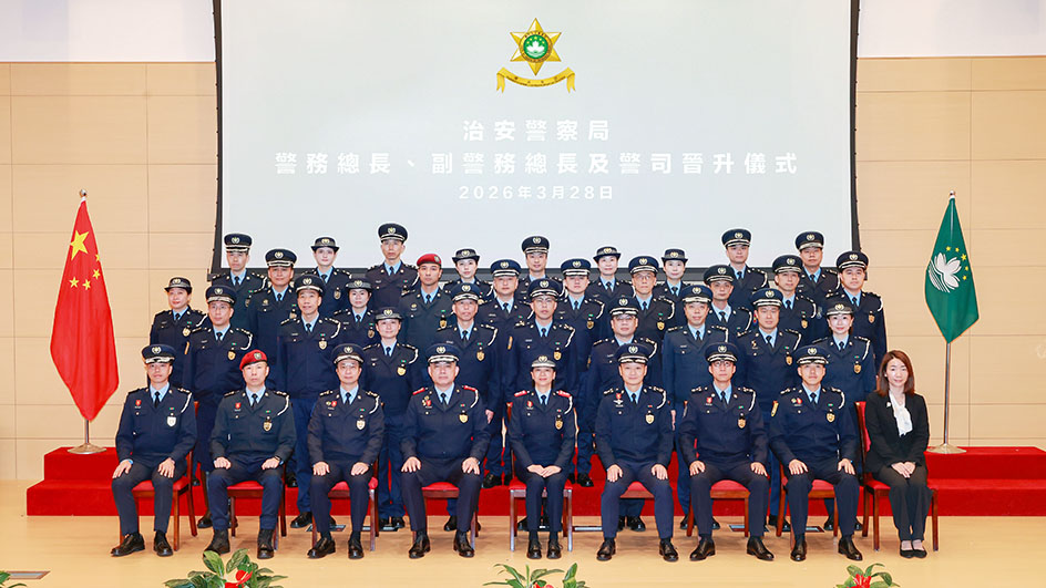 【特訊】3月28日上午,在治安警察局總部大樓舉行了警務總長、副警務總長及警司晉升儀式。儀式由伍素萍代局長主持,梁慶康副局長、鄭俊禧代副局長及各部門主管亦出席儀式,為晉升同僚致賀。