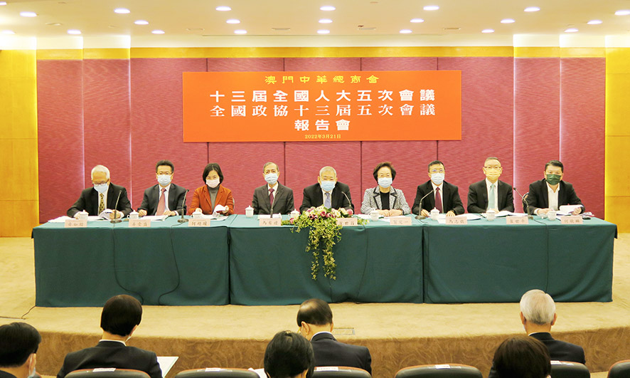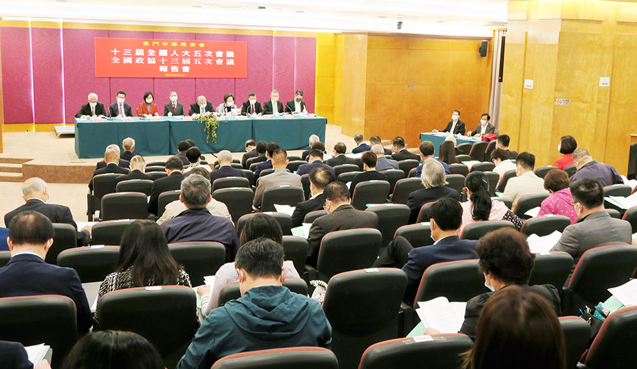 【特訊】澳門中華總商會昨(21)晚在會址舉行「十三屆全國人大五次會議、全國政協十三屆五次會議報告會」。報告會由會長崔世昌主持。全國政協委員、港澳台僑委員會副主任、中總副理事長賀定一,全國政協委員、中總副監事長黃如楷;全國人大代表、中總副理事長崔世平,全國人大代表、中總常務理事何敬麟先後向與會的會長、會董、理事、監事報告「兩會」基本情況和暢談參加「兩會」的感受和體會。
