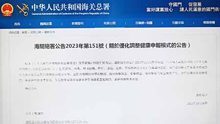 國家海關總署宣布今日(十一月一日)零時起,出入境人員免於填報《中華人民共和國出/入境健康申明卡》,海關總署發同時指出,若有發熱、咳嗽、呼吸困難、嘔吐、腹瀉、皮疹、不明原因皮下出血等傳染病症狀,或已經診斷患有傳染性疾病的出入境人員,須主動向海關健康申報,並配合海關做好體溫檢測、流行病學調查、醫學排查、採樣檢測等衛生檢疫工作。海關總署表示,如有隱瞞或逃避檢疫,將承擔相應法律責任;若引起檢疫傳染病傳播或者有傳播嚴重危險,須承擔相應刑事責任。