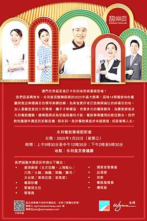 在配對會開始前,永利澳門將舉行講解會,介紹永利將展開的各項大型餐飲項目。此外,現場更設有餐飲技能展示區,以互動遊戲方式,介紹餐飲部職位及事業發展,助求職者了解餐飲五星服務的水準及要求,為面試作充份準備。配對會於永利皇宮會議廳舉行,報名日期為1月15日上午9時至1月21日中午12時。有意參加配對會的澳門居民,可登入勞工局行業專場配對會專頁(https://www.dsal.gov.mo/zh_tw/standard/wynn_jobmatching_session02.html)報名,名額有限,欲報從速。