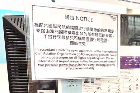 【特訊】為配合國際民航組織針對航空乘客攜帶及使用鋰電池行動電源所發佈的最新安全規定,民航局已指示機場專營公司及澳門航空,自今日起落實執行以下措施:每名出境航空乘客只可隨身攜帶最多兩個行動電源,且嚴禁在飛行期間對行動電源充電。新規定現已生效,進一步保障航空運輸安全。