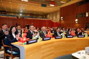 這是聯合國總部慶祝的第十七個中文日。活動由中國常駐聯合國代表團與中央廣播電視總台共同主辦,聯合國秘書處高官、各國使節逾200人出席。 中國常駐聯合國代表傅聰致辭表示,80多年來,中文忠實記錄了聯合國發展和中國同聯合國合作歷程,向世界傳遞多邊事業理想與行動。今年是新中國恢復聯合國合法席位55周年,中方願與各方一道,積極踐行全球文明倡議,譜寫命運與共的燦爛華章。