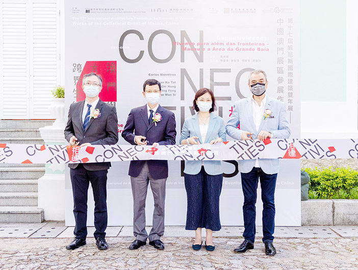 【特訊】由文化局轄下澳門藝術博物館主辦、澳門建築師協會協辦的「相連──澳門與大灣區跨界生活:第十七屆威尼斯國際建築雙年展中國澳門展區參展作品展」,昨日6月18日(星期五)下午6時30分於氹仔龍環葡韻舉行開幕儀式,由澳門特別行政區政府文化局局長穆欣欣、中央人民政府駐澳門特別行政區聯絡辦公室宣傳文化部副部長殷汝濤、澳門建築師協會主席梁頌衍、展覽策展人建築師馬若龍主禮。