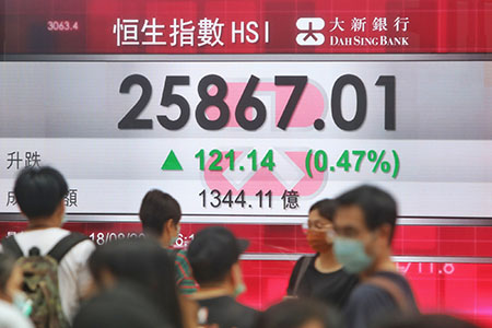 【香港中通社8月18日電】(記者李明珠) 香港股市連跌4個交易日後,在中資金融股等帶動下回穩,恆生指數18日收市升121點或0.47%、報25867點。全日成交額達1344.11億港元(港元,下同)。