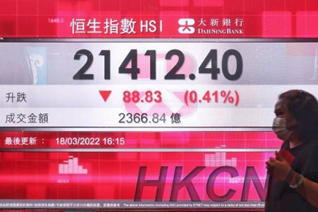 【新華社香港3月18日電】香港恒生指數18日跌88.83點,跌幅0.41%,收報21412.4點。全日主機板成交2366.84億港元。