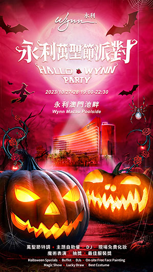 《永利萬聖節派對》詳情:日期:2023年10月27及28日,時間:晚上7時至10時半, 地點:永利澳門池畔。票價:標準門票澳門幣488元、四人座套票澳門幣1888元。特別優惠:澳門居民或永利臻享會員均可享8折優惠。門票發售:MPay 澳門錢包,查詢及預訂,歡迎致電 (853) 8986 3663 * 以上價格均需加收10%服務費及5%政府稅。