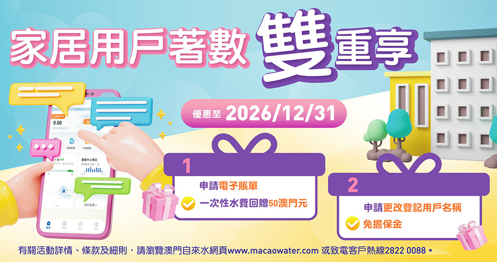 凡合資格的家居用戶由即日起至2026年12月31日前辦理「更改登記用戶名稱」將獲豁免擔保金(優惠不適用於首次安裝水錶、恢復供水、更改水錶口徑及新供水申請);首次申請電子賬單的客戶在成功激活並啟用服務後,將於下期水費單中獲得一次性50澳門元水費回贈。