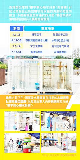 為增加公眾對“樓宇安心用水計劃”的認識,引起住戶對樓宇水箱清潔和衛生的關注,局方正在本澳八個地點開展社區巡迴展覽,展示實景製作的巨型邋遢水箱和潔淨水箱,展期到五月底;剛完成水箱展出的地點包括塔石廣場、祐漢街市公園、石排灣社區綜合大樓、水塘休憩區、青洲坊蓮花廣場及宋玉生公園,而今起展出巡迴至氹仔海濱休憩區及花城成都街。展出期間亦會逢週六、日在指定水箱展覽點擺放兩個攤位遊戲,以及派出專人向市民講解及介紹“樓宇安心用水計劃”。