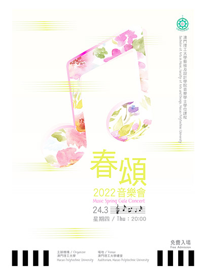 【特訊】澳門理工大學藝術及設計學院主辦的“春頌”音樂會,將於3月24日晚上八時,在該校禮堂舉行,主要由音樂課程學生擔綱演出,透過多首中西樂曲展現青春風采,並向社會展示教學成果,呈獻充滿青春氣息的音樂盛宴,精彩可期。