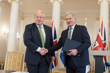 當天,芬蘭總統尼尼斯托同到訪的英國首相詹森舉行會晤,雙方討論了烏克蘭和歐洲安全局勢,隨即簽署聯合聲明。 聲明說,芬英兩國希望“加強適合任何情況的國防和安全合作”,在遭受災難或襲擊時,兩國將以各種方式相互協助,其中可能包括軍事手段。