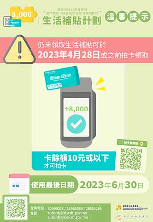 使用消費卡但仍未領取生活補貼的居民,可於2023年4月28日或之前,到全澳逾170個拍卡加值點拍卡領取。拍卡服務點清單已上載於“生活補貼計劃”專頁(https://www.dsedt.gov.mo/subsidy/zh-hant/topup_loc_list.jsp)。
