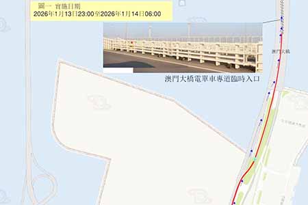 2026年1月14日晚上11時至翌日上午6時,澳門A區往氹仔的電單車道氹仔出口將臨時封閉,電單車駕駛者可於電單車專道道近氹仔端的一段位置駛入汽車車道前往氹仔。