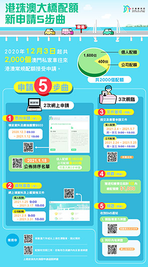 【特訊】2,000個澳門私家車往來港澳常規配額於去年12月接受申請,包括個人配額1,600個及公司配額400個。申請期已於本月12日結束,交通事務局共收到5,575宗意向申請,當中個人配額申請4,269宗,公司配額申請1,306宗,局方已於網上公佈電腦抽籤排序名單。