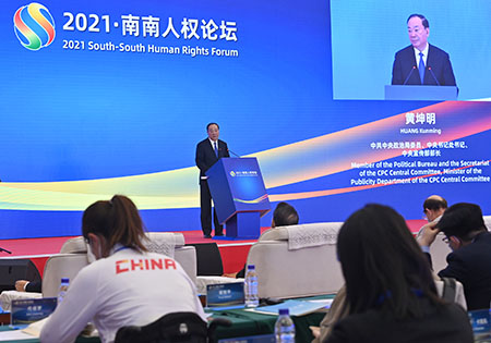 【中新社北京12月8日電】2021·南南人權論壇8日在北京舉行。中共中央政治局委員、中宣部部長黃坤明出席開幕式,宣讀習近平主席賀信並發表主旨演講。